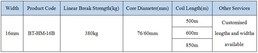 16mm Bonded Textile Strapping, contains no cross weave and is instead made of straight-line polyester filaments that are glued together.